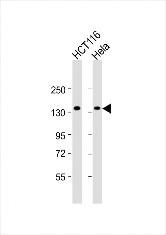 All lanes : Anti-ANKS1A Antibody (N-term) at 1:2000 dilution Lane 1: HCT116 whole cell lysate Lane 2: Hela whole cell lysate Lysates/proteins at 20 μg per lane. Secondary Goat Anti-Rabbit IgG, (H+L), Peroxidase conjugated at 1/10000 dilution. Predicted band size : 123 kDa Blocking/Dilution buffer: 5% NFDM/TBST. |
