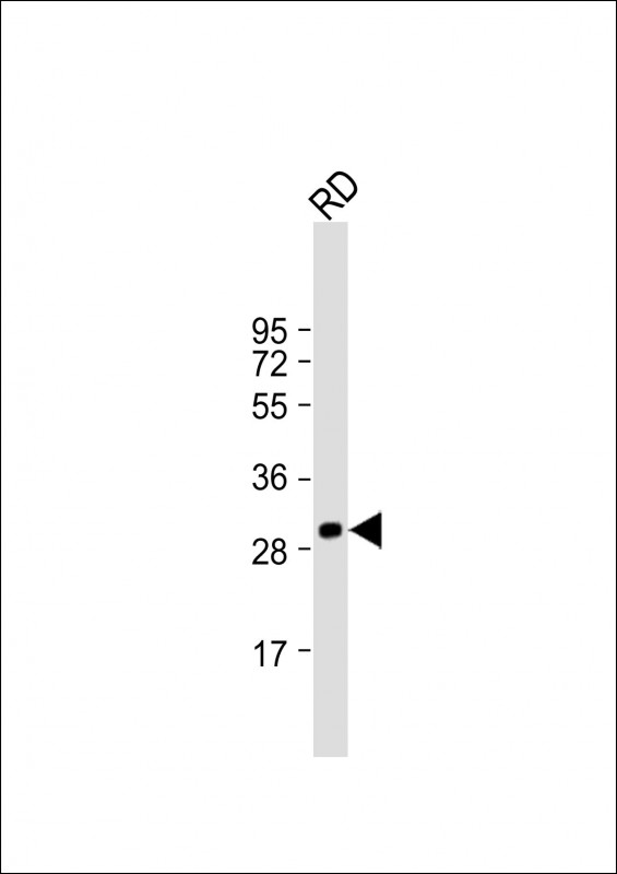 Anti-CCND2 Antibody (C-term S279/T280) at 1:1000 dilution + RD whole cell lysate Lysates/proteins at 20 μg per lane. Secondary Goat Anti-Rabbit IgG, (H+L), Peroxidase conjugated at 1/10000 dilution. Predicted band size : 33 kDa Blocking/Dilution buffer: 5% NFDM/TBST. |