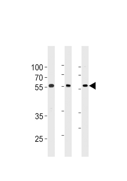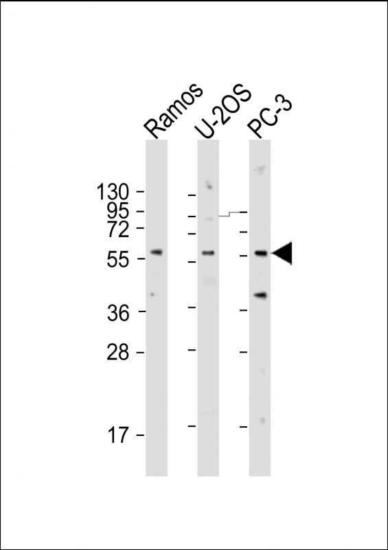 All lanes : Anti-TRIM6 Antibody (N-term) at 1:2000 dilution Lane 1: Ramos whole cell lysate Lane 2: U-2OS whole cell lysate Lane 3: PC-3 whole cell lysate Lysates/proteins at 20 μg per lane. Secondary Goat Anti-Rabbit IgG, (H+L), Peroxidase conjugated at 1/10000 dilution. Predicted band size : 56 kDa Blocking/Dilution buffer: 5% NFDM/TBST.