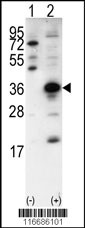 Western blot analysis of SNAI1(arrow) using rabbit polyclonal SNAI1 Antibody (N-term D24) (Cat.APR04614G). 293 cell lysates (2 ug/lane) either nontransfected (Lane 1) or transiently transfected with the SNAI1 gene (Lane 2) (Origene Technologies). |