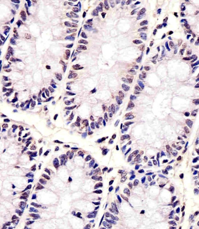 AP20643C staining CDKN1A in human colon tissue sections by Immunohistochemistry (IHC-P - paraformaldehyde-fixed, paraffin-embedded sections). Tissue was fixed with formaldehyde and blocked with 3% BSA for 0. 5 hour at room temperature; antigen retrieval was by heat mediation with a citrate buffer (pH6). Samples were incubated with primary antibody (1/25) for 1 hours at 37°C. A undiluted biotinylated goat polyvalent antibody was used as the secondary antibody.
