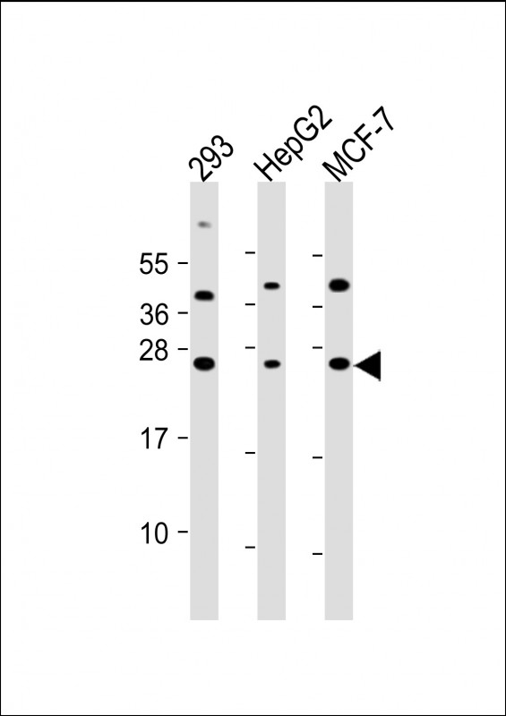 All lanes : Anti-CDKN1A Antibody (C-term) at 1:2000 dilution Lane 1: 293 whole cell lysate Lane 2: HepG2 whole cell lysate Lane 3: MCF-7 whole cell lysate Lysates/proteins at 20 μg per lane. Secondary Goat Anti-Rabbit IgG, (H+L), Peroxidase conjugated at 1/10000 dilution. Predicted band size : 18 kDa Blocking/Dilution buffer: 5% NFDM/TBST.