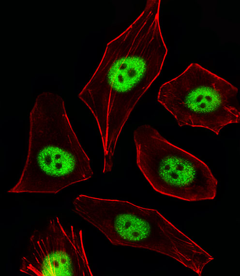 Fluorescent image of A549 cells stained with CDKN1A Antibody (C-term)( APR04643G). APR04643G was diluted at 1:25 dilution. An Alexa Fluor 488-conjugated goat anti-rabbit lgG at 1:400 dilution was used as the secondary antibody (green). Cytoplasmic actin was counterstained with Alexa Fluor? 555 conjugated with Phalloidin (red). Cytoplasm |