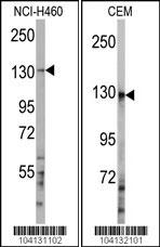 Western blot analysis of anti-UBE4A Antibody (C-term) (Cat.APR04779G) in NCI-H460 and CEM cell line lysates (35ug/lane). UBE4A (arrow) was detected using the purified Pab.