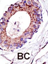 Formalin-fixed and paraffin-embedded human cancer tissue reacted with the primary antibody, which was peroxidase-conjugated to the secondary antibody, followed by DAB staining. This data demonstrates the use of this antibody for immunohistochemistry; clinical relevance has not been evaluated. BC = breast carcinoma; HC = hepatocarcinoma. |