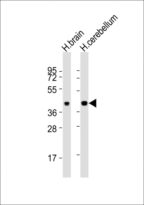 All lanes : Anti-SH3GL2 Antibody (Center) at 1:8000 dilution Lane 1: human brain lysates Lane 2: human cerebellum lysates Lysates/proteins at 20 μg per lane. Secondary Goat Anti-Rabbit IgG, (H+L), Peroxidase conjugated at 1/10000 dilution Predicted band size : 40 kDa Blocking/Dilution buffer: 5% NFDM/TBST. |