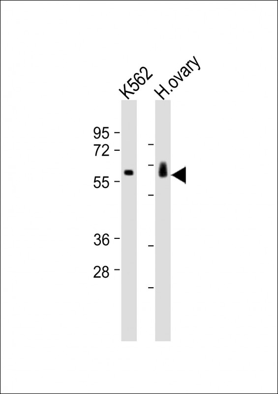 All lanes : Anti-C17orf80 Antibody (Center) at 1:1000-1:2000 dilution Lane 1: K562 whole cell lysates Lane 2: human ovary lysates Lysates/proteins at 20 μg per lane. Secondary Goat Anti-Rabbit IgG, (H+L), Peroxidase conjugated at 1/10000 dilution Predicted band size : 67 kDa Blocking/Dilution buffer: 5% NFDM/TBST. |