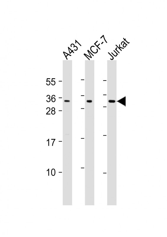 All lanes : Anti-CASP14 Antibody (N-Term) at 1:2000 dilution Lane 1: A431 whole cell lysates Lane 2: MCF-7 whole cell lysates Lane 3: Jurkat whole cell lysates Lysates/proteins at 20 μg per lane. Secondary Goat Anti-Rabbit IgG, (H+L), Peroxidase conjugated at 1/10000 dilution Predicted band size : 29 kDa Blocking/Dilution buffer: 5% NFDM/TBST. |