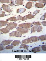 USP29 Antibody (Center) (Cat. APR04855G)immunohistochemistry analysis in formalin fixed and paraffin embedded human skeletal muscle followed by peroxidase conjugation of the secondary antibody and DAB staining.This data demonstrates the use of USP29 Antibody (Center) for immunohistochemistry. Clinical relevance has not been evaluated. |