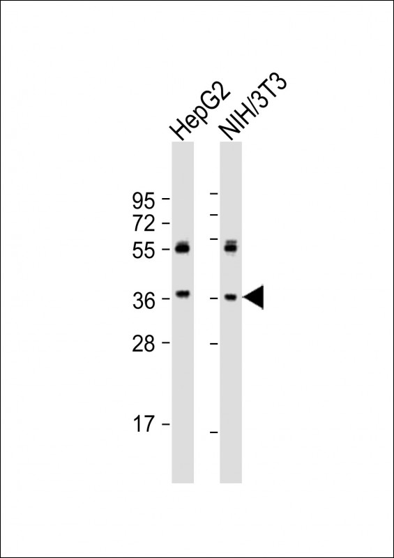 All lanes : Anti-MAP2K6 Antibody (C-Term) at 1:2000 dilution Lane 1: HepG2 whole cell lysates Lane 2: NIH/3T3 whole cell lysates Lysates/proteins at 20 μg per lane. Secondary Goat Anti-Rabbit IgG, (H+L), Peroxidase conjugated at 1/10000 dilution Predicted band size : 37 kDa Blocking/Dilution buffer: 5% NFDM/TBST. |