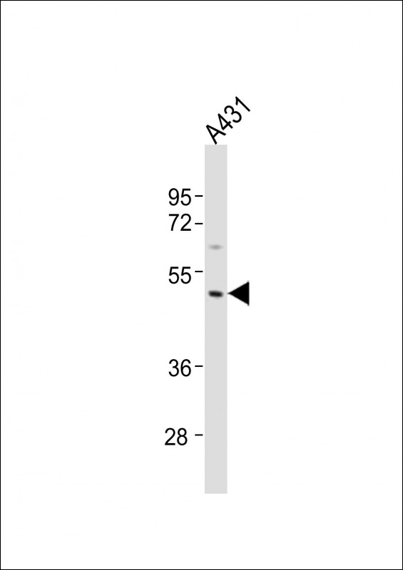 Anti-MMP23A Antibody (C-Term)at 1:1000 dilution + A431 whole cell lysates Lysates/proteins at 20 μg per lane. Secondary Goat Anti-Rabbit IgG, (H+L), Peroxidase conjugated at 1/10000 dilution Predicted band size : 44 kDa Blocking/Dilution buffer: 5% NFDM/TBST. |