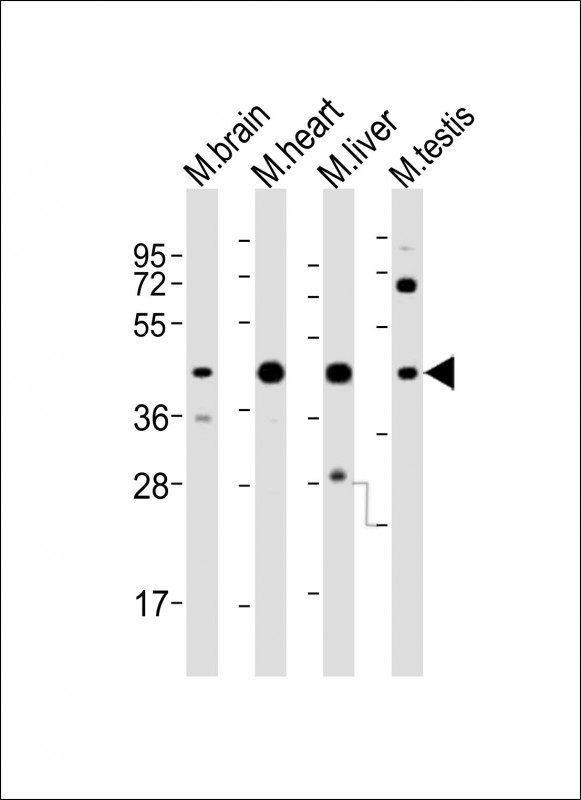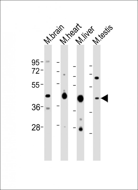 All lanes : Anti-Utf1 Antibody (C-term) at 1:2000 dilution Lane 1: mouse brain lysates Lane 2: mouse heart lysates Lane 3: mouse liver lysates Lane 4: mouse testis lysates Lysates/proteins at 20 μg per lane. Secondary Goat Anti-Rabbit IgG, (H+L), Peroxidase conjugated at 1/10000 dilution. Predicted band size : 36 kDa. Blocking/Dilution buffer: 5% NFDM/TBST. |
