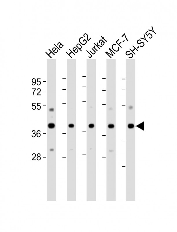 All lanes : Anti-RAE1 Antibody (N-Term) at 1:2000-1:4000 dilution Lane 1: Hela whole cell lysate Lane 2: HepG2 whole cell lysate Lane 3: Jurkat whole cell lysate Lane 4: MCF-7 whole cell lysate Lane 5: SH-SY5Y whole cell lysate Lysates/proteins at 20 μg per lane. Secondary Goat Anti-Rabbit IgG, (H+L), Peroxidase conjugated at 1/10000 dilution. Predicted band size : 41 kDa Blocking/Dilution buffer: 5% NFDM/TBST. |