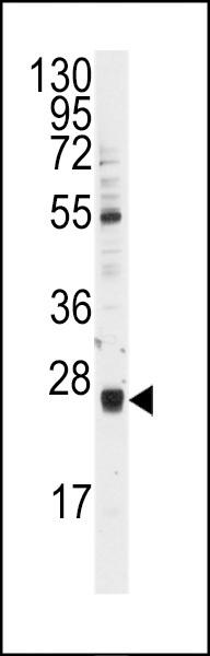 Western blot analysis of anti-UBCH9 Antibody (N-term) (Cat.APR04899G) in Y79 cell line lysates (35ug/lane). UBCH9 (arrow) was detected using the purified Pab.