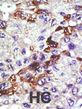 Formalin-fixed and paraffin-embedded human cancer tissue reacted with the primary antibody, which was peroxidase-conjugated to the secondary antibody, followed by AEC staining. This data demonstrates the use of this antibody for immunohistochemistry; clinical relevance has not been evaluated. BC = breast carcinoma; HC = hepatocarcinoma. |