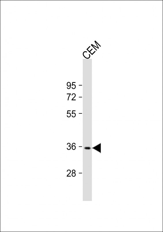 Anti-RNF126 Antibody (Center) at 1:2000 dilution + CEM whole cell lysate Lysates/proteins at 20 μg per lane. Secondary Goat Anti-Rabbit IgG, (H+L), Peroxidase conjugated at 1/10000 dilution. Predicted band size : 36 kDa Blocking/Dilution buffer: 5% NFDM/TBST. |