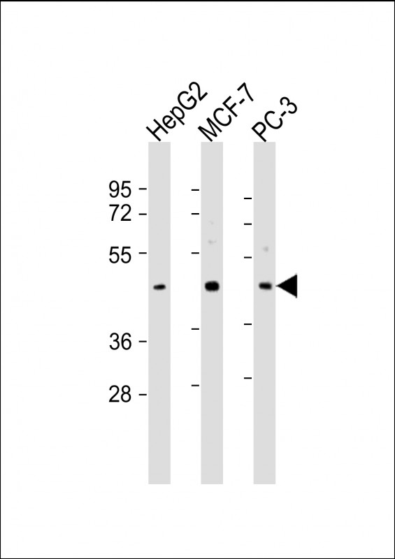 All lanes : Anti-SAPCD2 Antibody (C-Term) at 1:2000 dilution Lane 1: HepG2 whole cell lysate Lane 2: MCF-7 whole cell lysate Lane 3: PC-3 whole cell lysate Lysates/proteins at 20 μg per lane. Secondary Goat Anti-Rabbit IgG, (H+L), Peroxidase conjugated at 1/10000 dilution. Predicted band size : 43 kDa Blocking/Dilution buffer: 5% NFDM/TBST. |