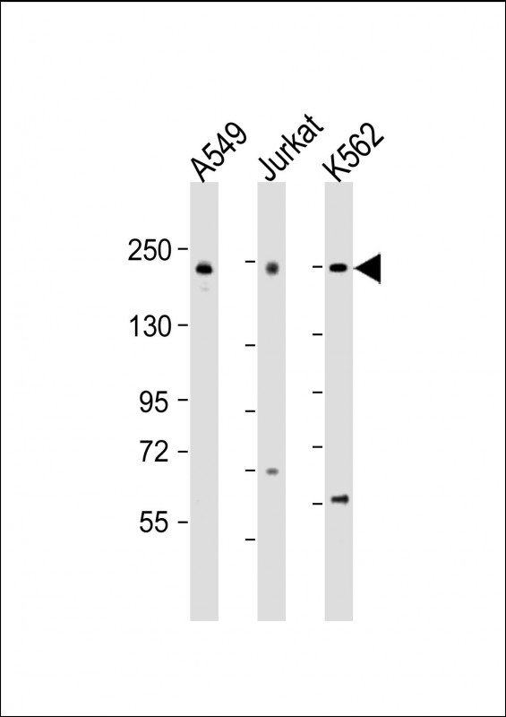 All lanes : Anti-PSME4 Antibody (N-Term) at 1:2000 dilution Lane 1: A549 whole cell lysate Lane 2: Jurkat whole cell lysate Lane 3: K562 whole cell lysate Lysates/proteins at 20 μg per lane. Secondary Goat Anti-Rabbit IgG, (H+L), Peroxidase conjugated at 1/10000 dilution. Predicted band size : 211 kDa Blocking/Dilution buffer: 5% NFDM/TBST. |