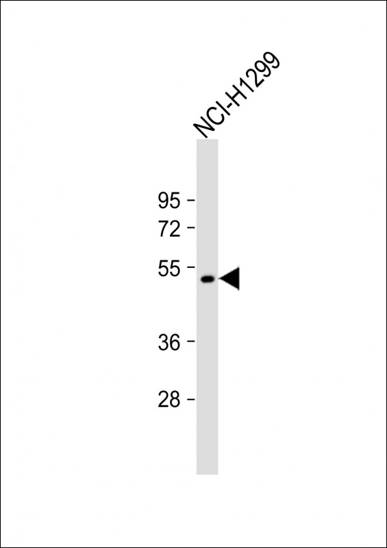 Anti-F7 Antibody (C-Term) at 1:2000 dilution + NCI-H1299 whole cell lysate Lysates/proteins at 20 μg per lane. Secondary Goat Anti-Rabbit IgG, (H+L), Peroxidase conjugated at 1/10000 dilution. Predicted band size : 52 kDa Blocking/Dilution buffer: 5% NFDM/TBST. |