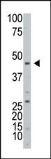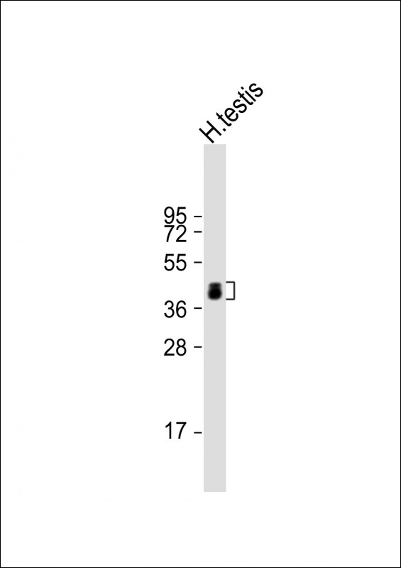 Anti-ART3 Antibody at 1:4000 dilution + human testis lysate Lysates/proteins at 20 μg per lane. Secondary Goat Anti-Rabbit IgG, (H+L), Peroxidase conjugated at 1/10000 dilution. Predicted band size : 44 kDa Blocking/Dilution buffer: 5% NFDM/TBST.