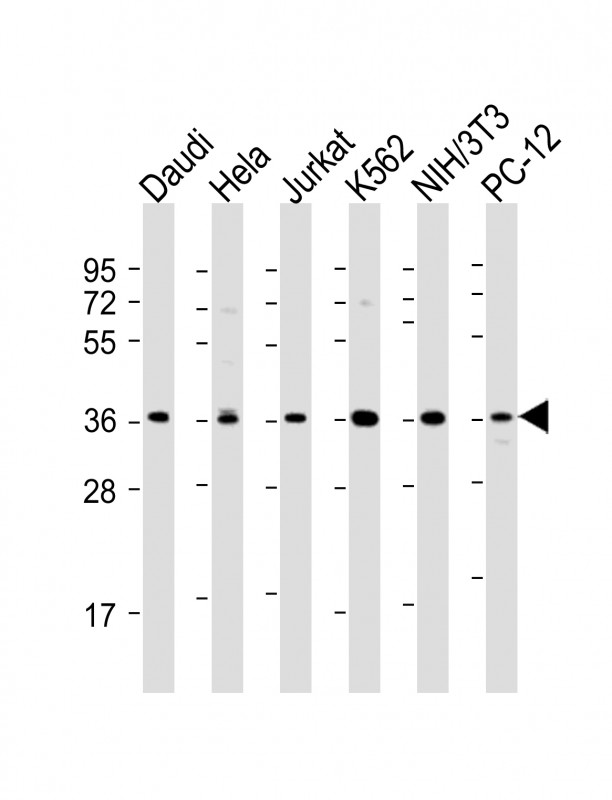 All lanes : Anti-Sumo-site. NFkB Antibody at 1:2000 dilution Lane 1: Daudi whole cell lysate Lane 2: Hela whole cell lysate Lane 3: Jurkat whole cell lysate Lane 4: K562 whole cell lysate Lane 5: NIH/3T3 whole cell lysate Lane 6: PC-12 whole cell lysate Lysates/proteins at 20 μg per lane. Secondary Goat Anti-Rabbit IgG, (H+L), Peroxidase conjugated at 1/10000 dilution. Predicted band size : 36 kDa Blocking/Dilution buffer: 5% NFDM/TBST. |