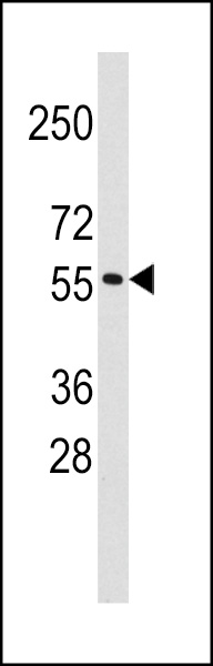 Western blot analysis of anti-TRIM69 Antibody (Center H215) (RB13950) in K562 cell line lysates (35ug/lane). TRIM69(arrow) was detected using the purified Pab. |