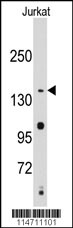 Western blot analysis of anti-SMC2 Antibody (C-term) (Cat.APR05052G) in Jurkat cell line lysates (35ug/lane). SMC2(arrow) was detected using the purified Pab. |