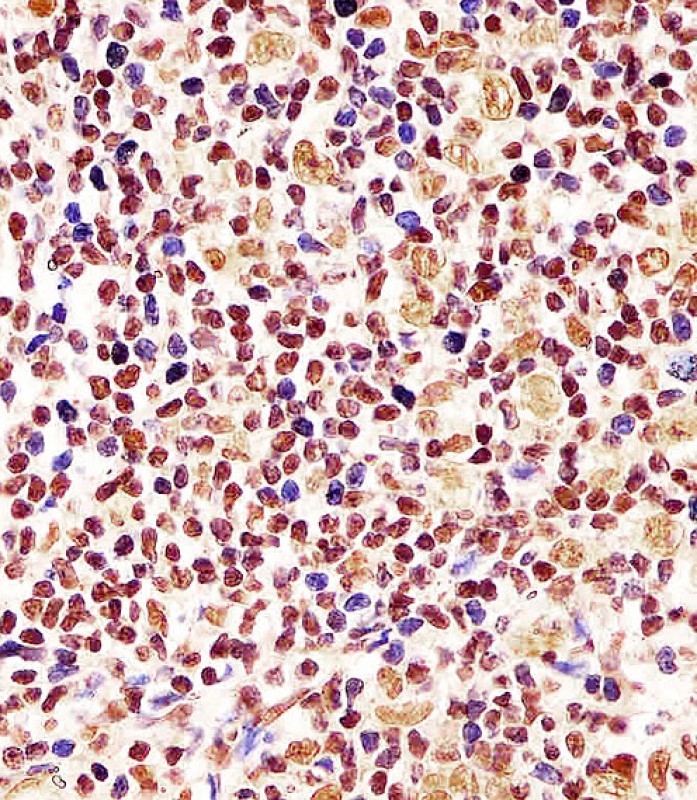 AP2612D staining Cyclin D1 in human tonsil tissue sections by Immunohistochemistry (IHC-P - paraformaldehyde-fixed, paraffin-embedded sections). Tissue was fixed with formaldehyde and blocked with 3% BSA for 0. 5 hour at room temperature; antigen retrieval was by heat mediation with a citrate buffer (pH6). Samples were incubated with primary antibody (1/25) for 1 hours at 37°C. A undiluted biotinylated goat polyvalent antibody was used as the secondary antibody.
