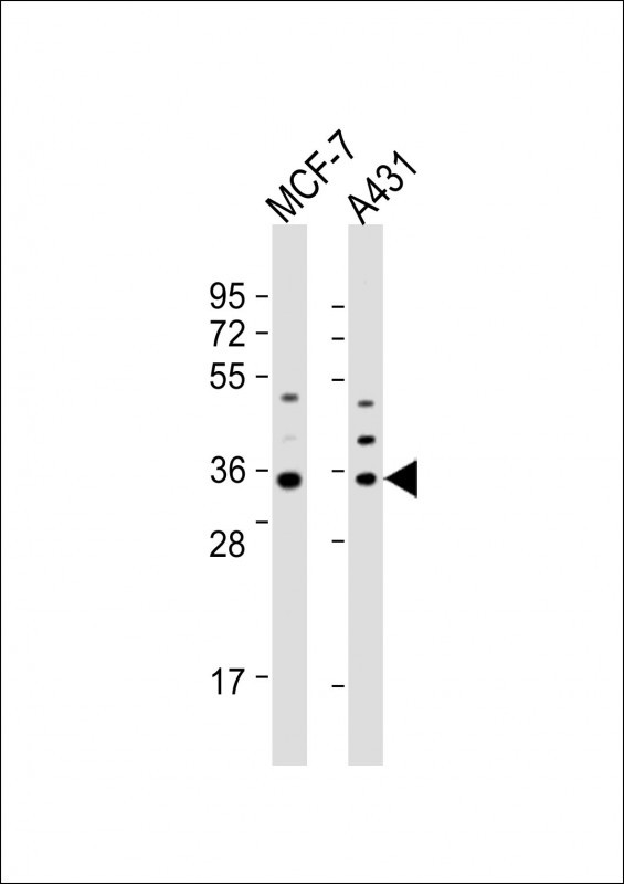 All lanes : Anti-Cyclin D1 Antibody (S90) at 1:2000 dilution Lane 1: MCF-7 whole cell lysate Lane 2: A431 whole cell lysate Lysates/proteins at 20 μg per lane. Secondary Goat Anti-Rabbit IgG, (H+L), Peroxidase conjugated at 1/10000 dilution. Predicted band size : 34 kDa Blocking/Dilution buffer: 5% NFDM/TBST. |