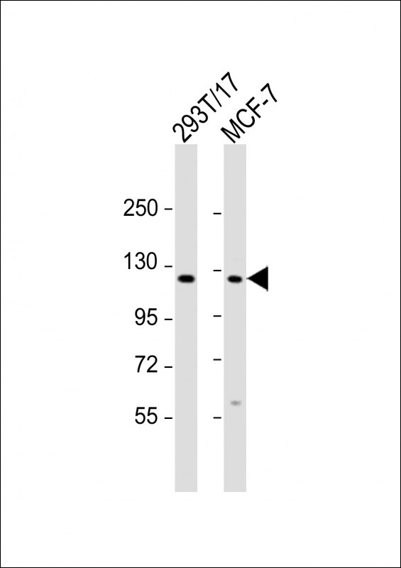 All lanes : Anti-VE Cadherin Antibody (CDH5) (N-term) at 1:2000 dilution Lane 1: 293T/17 whole cell lysate Lane 2: MCF-7 whole cell lysate Lysates/proteins at 20 μg per lane. Secondary Goat Anti-Rabbit IgG, (H+L), Peroxidase conjugated at 1/10000 dilution. Predicted band size : 88 kDa Blocking/Dilution buffer: 5% NFDM/TBST.