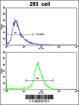 Flow cytometric analysis of 293 cells using VE Cadherin Antibody (CDH5) (N-term)(bottom histogram) compared to a negative control cell (top histogram). FITC-conjugated goat-anti-rabbit secondary antibodies were used for the analysis. |