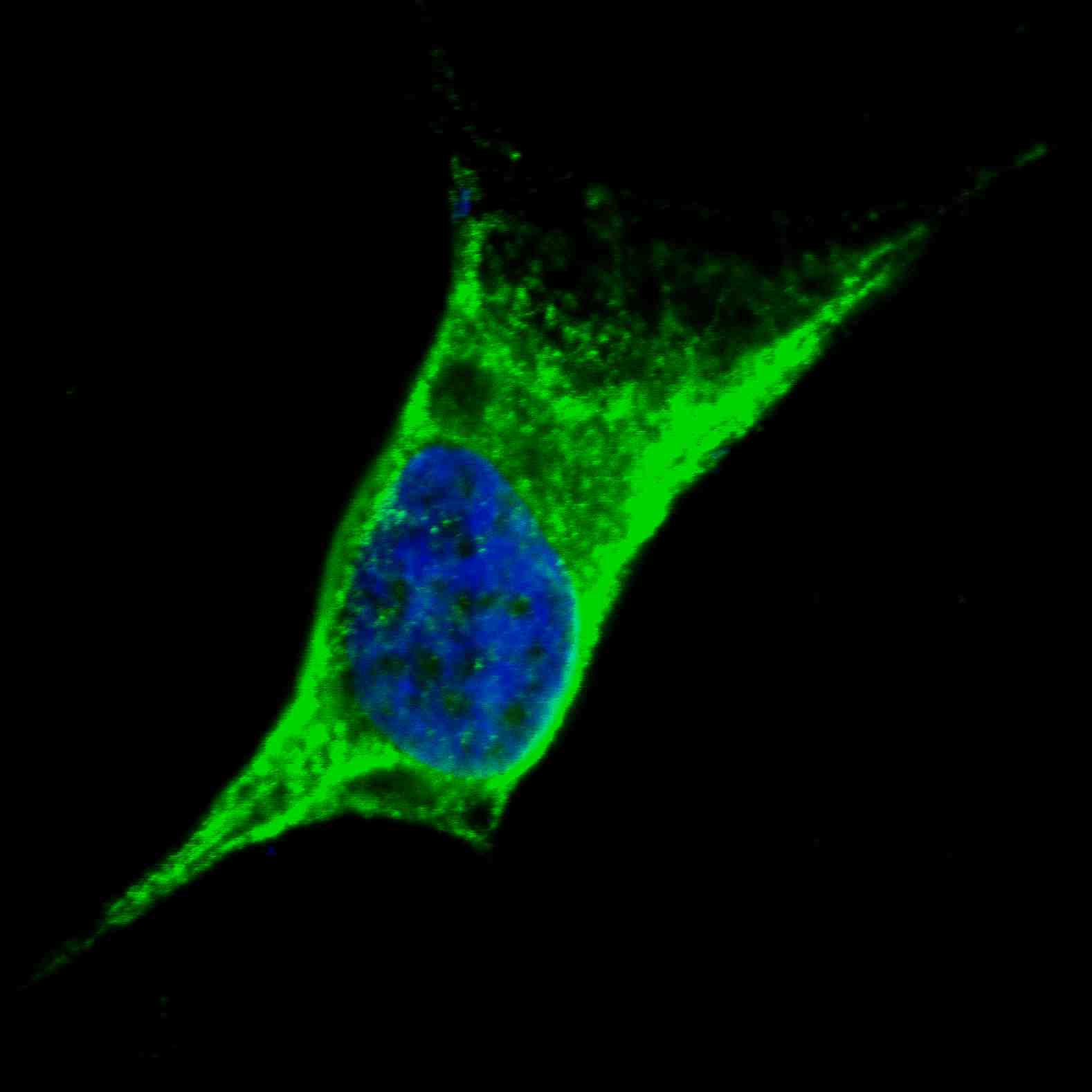 Fluorescent confocal image of SY5Y cells stained with Vimentin (C-term) antibody. SY5Y cells were fixed with 4% PFA (20 min), permeabilized with Triton X-100 (0.2%, 30 min). Cells were then incubated with APR05063G Vimentin (C-term) primary antibody (1:100, 2 h at room temperature). For secondary antibody, Alexa Fluor? 488 conjugated donkey anti-rabbit antibody (green) was used (1:1000, 1h). Nuclei were counterstained with Hoechst 33342 (blue) (10 μg/ml, 5 min). Note the highly specific localization of the Vimentin immunosignal to the cytoskeleton, supported by Human Protein Atlas Data (http://www.proteinatlas.org/ENSG00000026025).