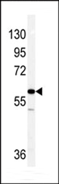 Western blot analysis of Vimentin antibody (C-term) (Cat.APR05063G) in NCI-H460 cell line lysates (35ug/lane). Vimentin (arrow) was detected using the purified Pab . |