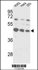 Western blot analysis of SSB Antibody (C-term) (Cat.APR05076G) in K562, Hela, 293 cell line lysates (35ug/lane). SSB (arrow) was detected using the purified Pab.