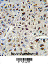 Formalin-fixed and paraffin-embedded human hepatocarcinoma reacted with SSB Antibody (C-term) (Cat.APR05076G), which was peroxidase-conjugated to the secondary antibody, followed by DAB staining. This data demonstrates the use of this antibody for immunohistochemistry; clinical relevance has not been evaluated. |