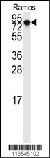 Western blot analysis of anti-DLG7 Antibody (N-term) (Cat.APR05078G) in Ramos cell line lysates (35ug/lane). DLG7(arrow) was detected using the purified Pab. |