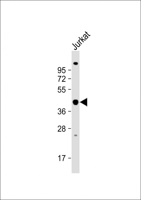 Anti-PSMD13 Antibody (C-term) at 1:1000 dilution + Jurkat whole cell lysate Lysates/proteins at 20 μg per lane. Secondary Goat Anti-Rabbit IgG, (H+L), Peroxidase conjugated at 1/10000 dilution. Predicted band size : 43 kDa Blocking/Dilution buffer: 5% NFDM/TBST.