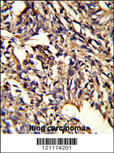 Formalin-fixed and paraffin-embedded human lung carcinoma reacted with PSMD13 Antibody (C-term), which was peroxidase-conjugated to the secondary antibody, followed by DAB staining. This data demonstrates the use of this antibody for immunohistochemistry; clinical relevance has not been evaluated. |