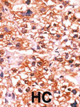 Formalin-fixed and paraffin-embedded human cancer tissue reacted with the primary antibody, which was peroxidase-conjugated to the secondary antibody, followed by AEC staining. This data demonstrates the use of this antibody for immunohistochemistry; clinical relevance has not been evaluated. BC = breast carcinoma; HC = hepatocarcinoma. |