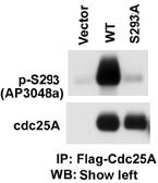 The anti-Phospho-CDC25A-S293 Pab (Cat. APR05104G) is used in Western blot to detect Phospho-CDC25A-S293 in cells transfected with wild type or mutant S293A of CDC25A. Data courtesy of Dr. Tiebang Kang of Washington University, St. Louis, MO.