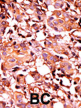 Formalin-fixed and paraffin-embedded human cancer tissue reacted with the primary antibody, which was peroxidase-conjugated to the secondary antibody, followed by AEC staining. This data demonstrates the use of this antibody for immunohistochemistry; clinical relevance has not been evaluated. BC = breast carcinoma; HC = hepatocarcinoma. |