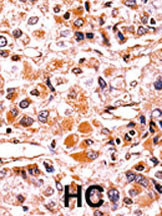 Formalin-fixed and paraffin-embedded human cancer tissue reacted with the primary antibody, which was peroxidase-conjugated to the secondary antibody, followed by AEC staining. This data demonstrates the use of this antibody for immunohistochemistry; clinical relevance has not been evaluated. BC = breast carcinoma; HC = hepatocarcinoma. |
