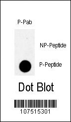 Dot blot analysis of anti-Phospho- P21CIP1-S146 Antibody (Cat.APR05138G) on nitrocellulose membrane. 50ng of Phospho-peptide or Non Phospho-peptide per dot were adsorbed. Antibody working concentrations are 0.5ug per ml.