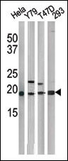 The anti-Phospho- P21CIP1-S146 Pab (Cat. APR05138G) is used in Western blot to detect Phospho- P21CIP1-S146 in, from left to right, Hela, Y79, T47D, and 293 tissue lysates.