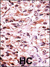 Formalin-fixed and paraffin-embedded human cancer tissue reacted with the primary antibody, which was peroxidase-conjugated to the secondary antibody, followed by DAB staining. This data demonstrates the use of this antibody for immunohistochemistry; clinical relevance has not been evaluated. BC = breast carcinoma; HC = hepatocarcinoma |