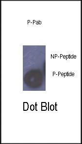 Dot blot analysis of anti-Phospho-Rb-S780 Antibody (Cat. APR05149G) on nitrocellulose membrane. 50ng of Phospho-peptide or Non Phospho-peptide per dot were adsorbed. Antibody working concentrations are 0.5ug per ml.