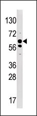 Western blot analysis of anti-Phospho-Syk Pab(Cat. APR05156G) in mouse liver tissue lysate (35ug/lane). Phospho-Syk(arrow) was detected using the purified Pab.