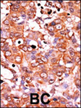 Formalin-fixed and paraffin-embedded human cancer tissue reacted with the primary antibody, which was peroxidase-conjugated to the secondary antibody, followed by DAB staining. This data demonstrates the use of this antibody for immunohistochemistry; clinical relevance has not been evaluated. BC = breast carcinoma; HC = hepatocarcinoma |
