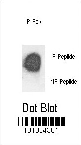 Dot blot analysis of anti-Phospho-mPLM-pS88.repeat Phospho-specific Pab (Cat. APR05161G) on nitrocellulose membrane. 50ng of Phospho-peptide or Non Phospho-peptide per dot were adsorbed. Antibody working concentrations are 0.5ug per ml.
