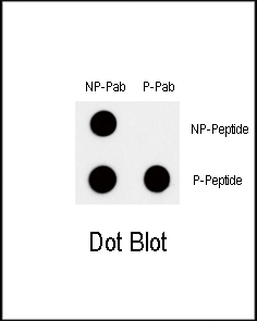 Dot blot analysis of Phospho-MYC-T58 Pab (Cat.APR05172G) on nitrocellulose membrane. 50ng of Phospho-peptide or Non Phospho-peptide per dot were adsorbed. Antibody working concentrations are 0.5ug per ml.